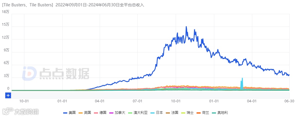 累计总收入达15.6亿元,其中美国、日本、英分别以65.39%、5.08%以及5.03%的贡献位列TOP3。虽然2023年开始月流水开始缓慢下降,由于整体依然在高位,因此全年收入达到了可怕的9.73亿元,秒杀赛道中的所有产品,当时腾讯还在Q1财报中专门提到该游戏,表示该作在竞争激烈的消除品类上取得了突破性的成功。