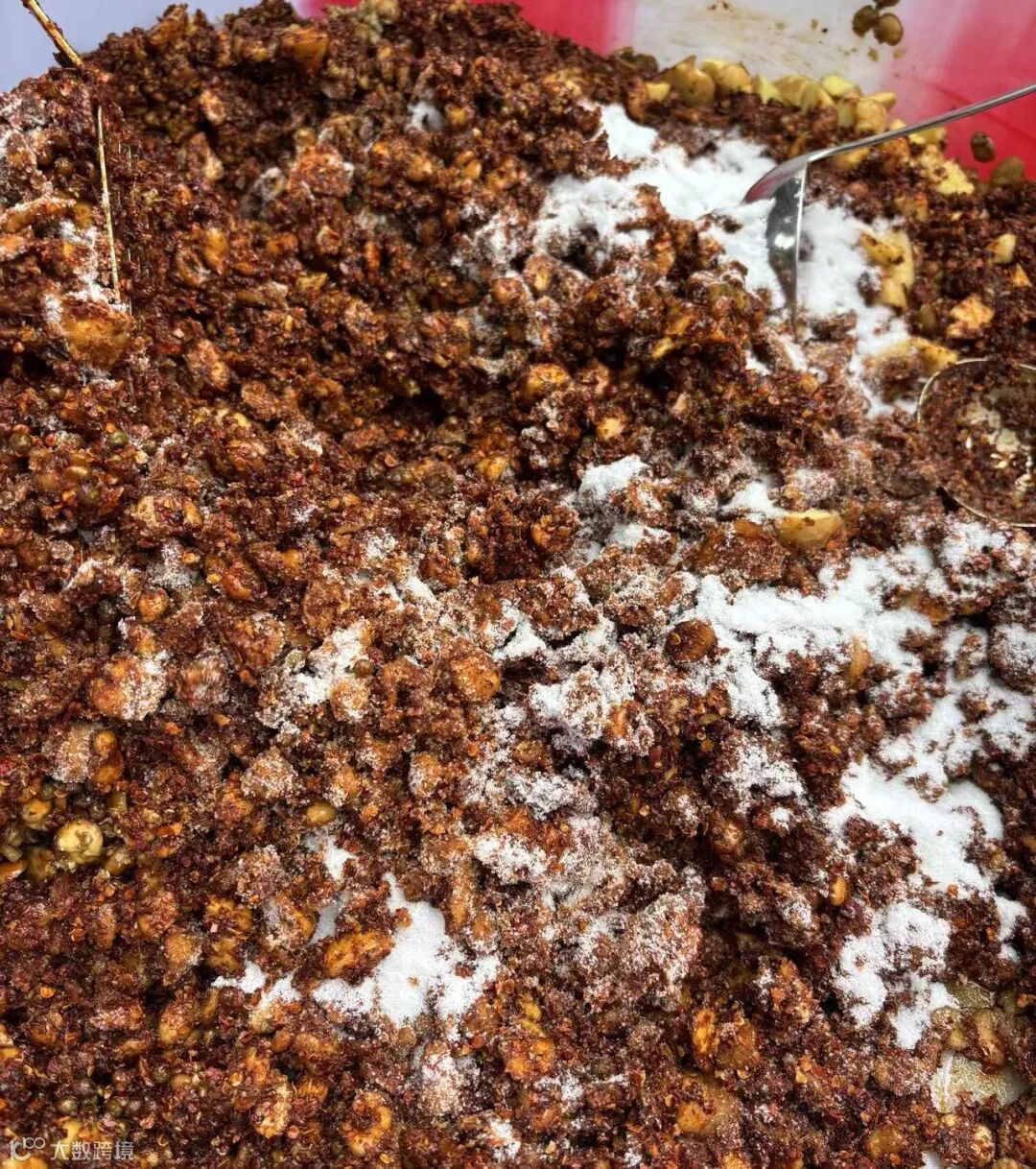 最后,再加入菜籽油和清水,边加边搅拌。搅拌充分后放在阳光下进行直晒。这个时候,也需要进行必要的搅拌。一般需要嗮5天左右,过程中需要根据情况加入适当的清水进行搅拌,使干湿比例达到1:1左右。