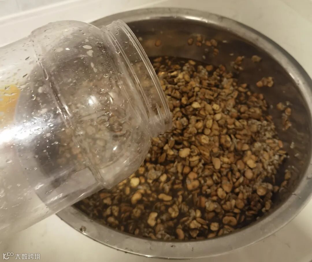 将晾干的豆瓣放入盆中,然后加入醪糟,进行搅拌。这个时候,会有一股浓浓的酱香味道,有点郎酒、茅台开瓶的感觉。关于如何自制醪糟,后面有时间再介绍给大家(醪糟的制作比较简单)。