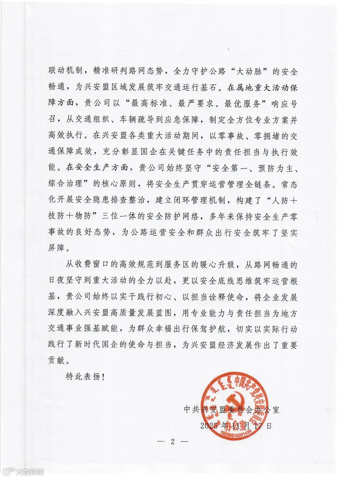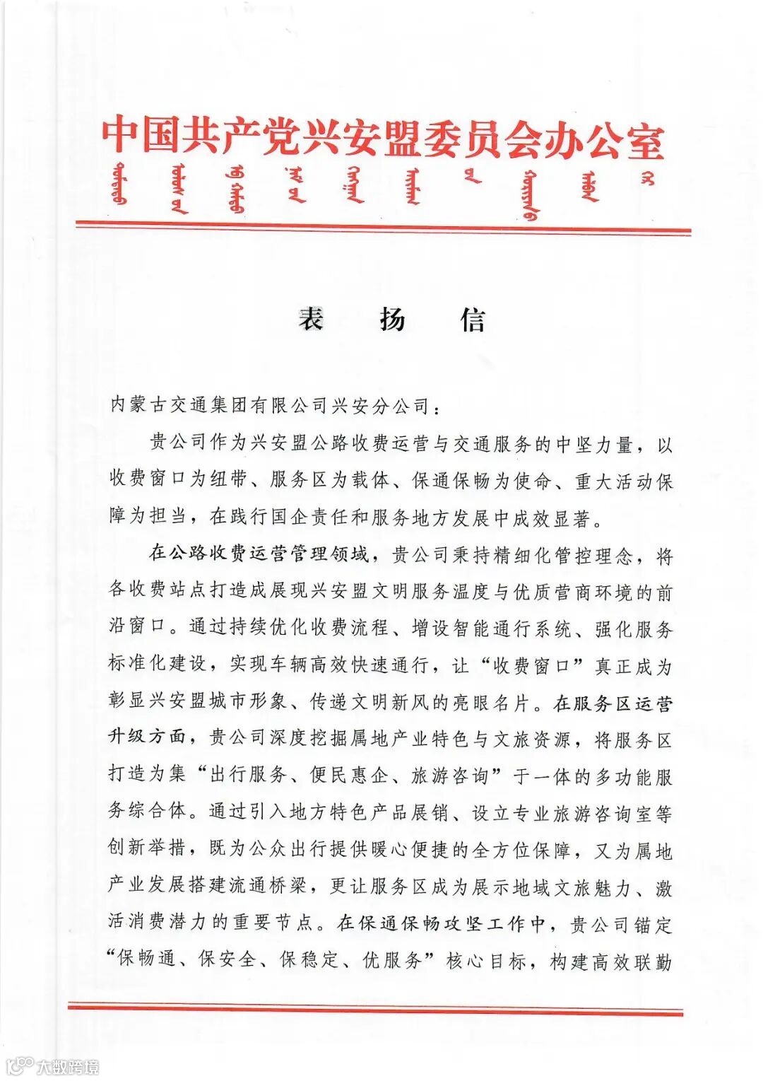 近日,内蒙古交通集团兴安分公司收到兴安盟委办公室发来的表扬信,对分公司在公路收费运营、服务区升级、保通保畅、重大活动保障和安全生产等方面的工作成效给予高度评价。