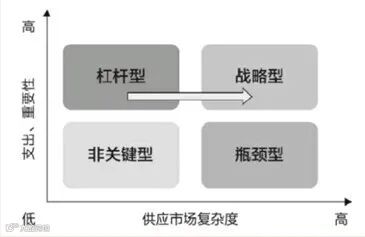 卡拉杰克模型根据采购支出及品类的重要性和供应市场复杂度将品类分为四种类型,即杠杆型、战略型、瓶颈型和非关键型。其中: