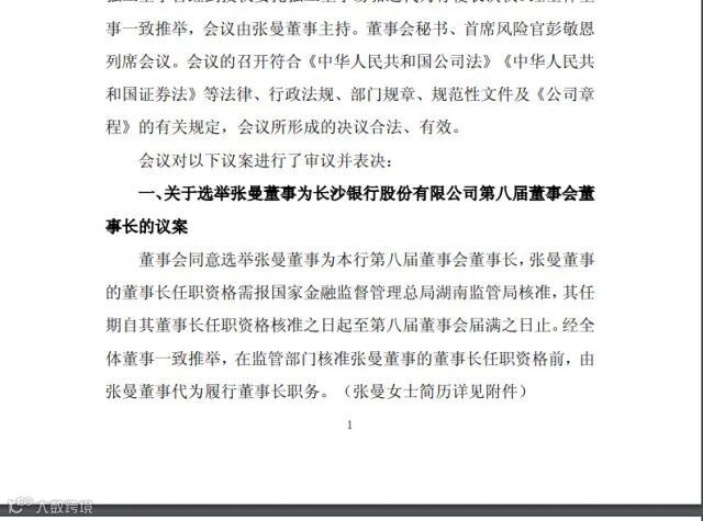 长沙银行近日发布第八届董事会第四次临时会议决议公告,会议审议通过了《关于选举张曼董事为长沙银行股份有限公司第八届董事会董事长的议案》,董事会同意选举张曼董事为该行第八届董事会董事长。