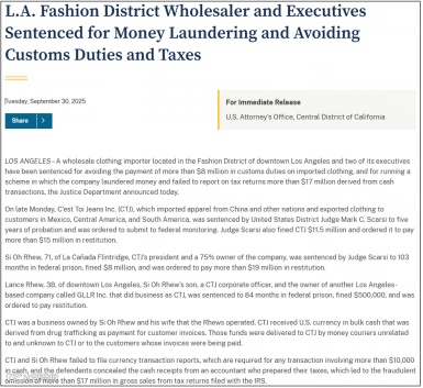 该公司通过515笔电汇向海外供应商支付1.37亿美元,累计低报货值超5100万美元,导致美国关税损失约840万美元。法院判决公司罚款1150万美元并赔偿1500万美元,总裁Si0hRhew获刑103个月、罚款800万美元并承担1900万美元赔偿金,高管LanceRhew亦被判处84个月监禁。