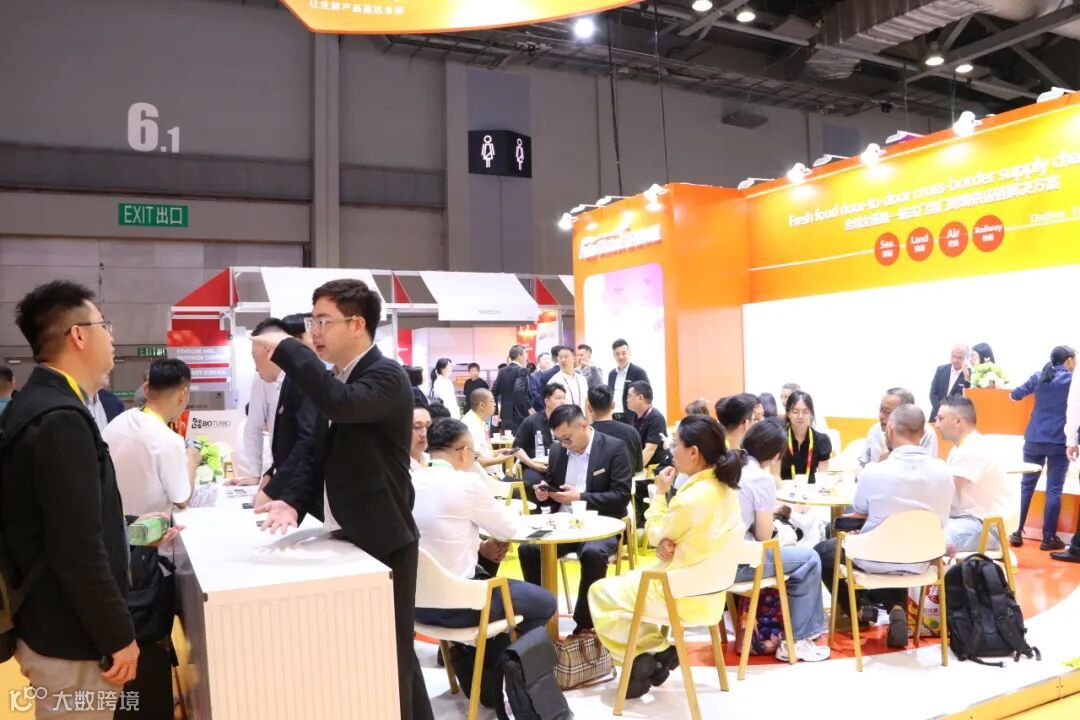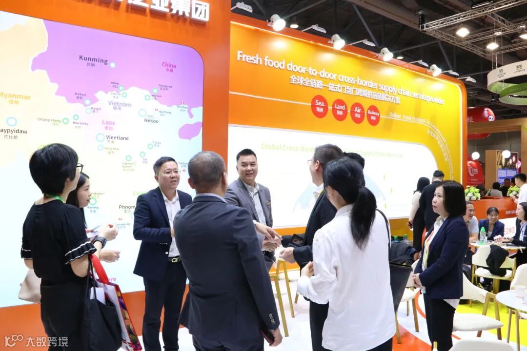 集团本次的展台以活力明快的橙黄色调为主,步入展台, “一路领鲜” 陆运柜装置格外醒目,搭配多重结构的环形流线吊顶,造型感十足。洽谈区展示画面清晰标注泰国、越南、老挝等东南亚生鲜产地,以及广西、云南等国内西南核心区位,直观聚焦东南亚与西南地区陆运及陆铁联运核心业务,快速吸引参展观众关注。