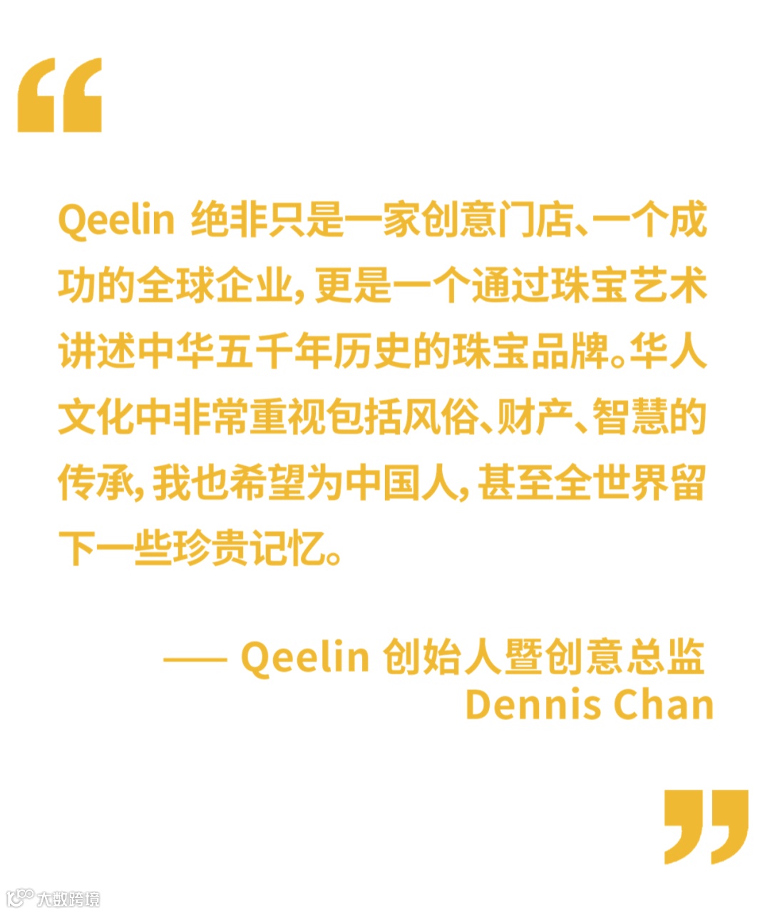 Dennis Chan 如此描述他对 Qeelin 的情感:“Qeelin 绝非只是一家创意门店、一个成功的全球企业,更是一个通过珠宝艺术讲述中华五千年历史的珠宝品牌。华人文化中非常重视包括风俗、财产、智慧的传承,我也希望为中国人,甚至全世界留下一些珍贵记忆。”