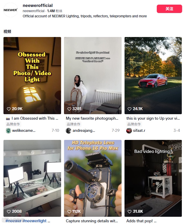 Neewer敏锐把握社交媒体对海外消费决策的影响,积极布局TikTok、YouTube、Instagram、Facebook等平台。其官方账号@neewerofficial在TikTok粉丝数超140万,通过创意视频展示产品功能与实际应用场景。