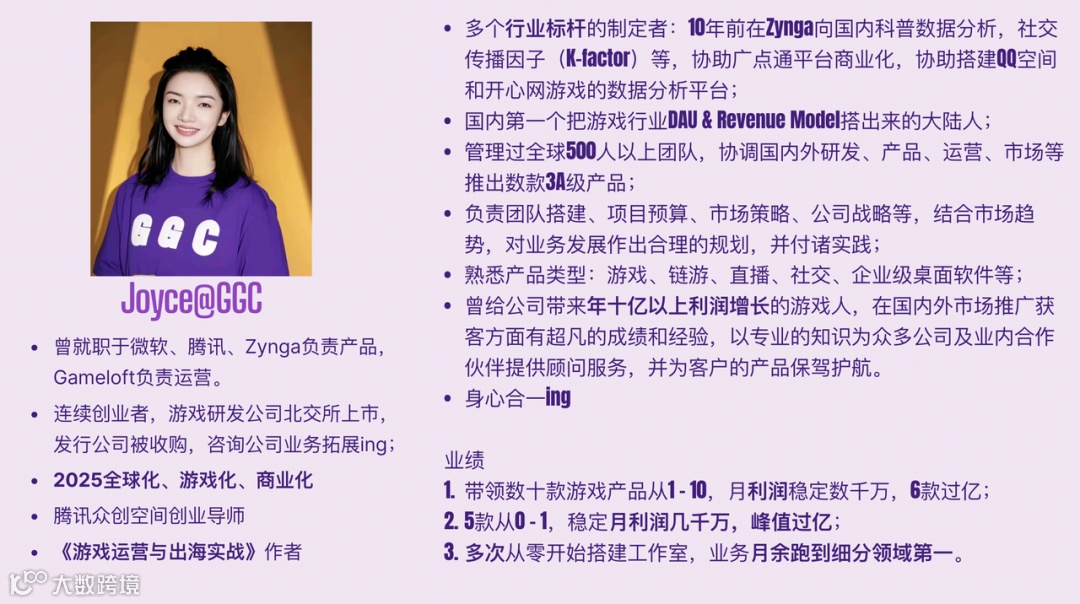 我是Joyce,全球游戏战略咨询顾问。曾任微软、腾讯专家,并作为亿级产品操盘手,深度参与多款Casino及混合品类游戏的全球发行与商业化设计。
