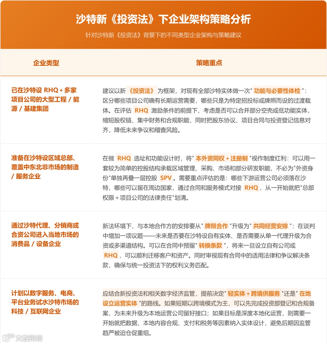 在这样的格局下,新《投资法》不是简单的流程调整,而是在悄悄推动企业从“项目驱动的碎片化设立”,走向“围绕一个清晰的沙特业务版图,做统一结构设计和长期经营规划”。