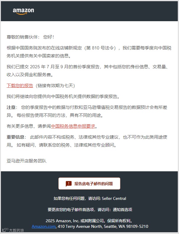 亚马逊近日向中国卖家推送了《查看您的 2025 年 7 月至 9 月的中国税务报告》邮件,通知卖家下载第三季度店铺税务数据。该报告已自动转换为人民币,且为提交至税务部门的正式数据,建议及时查收并核对。