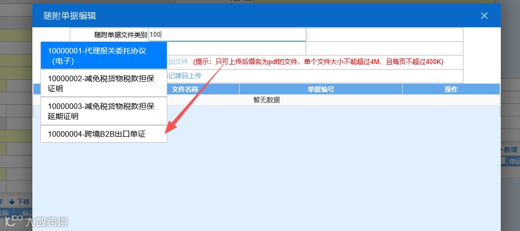 - 在随附单据文件类别栏选择“10000004-跨境B2B出口单证”;
