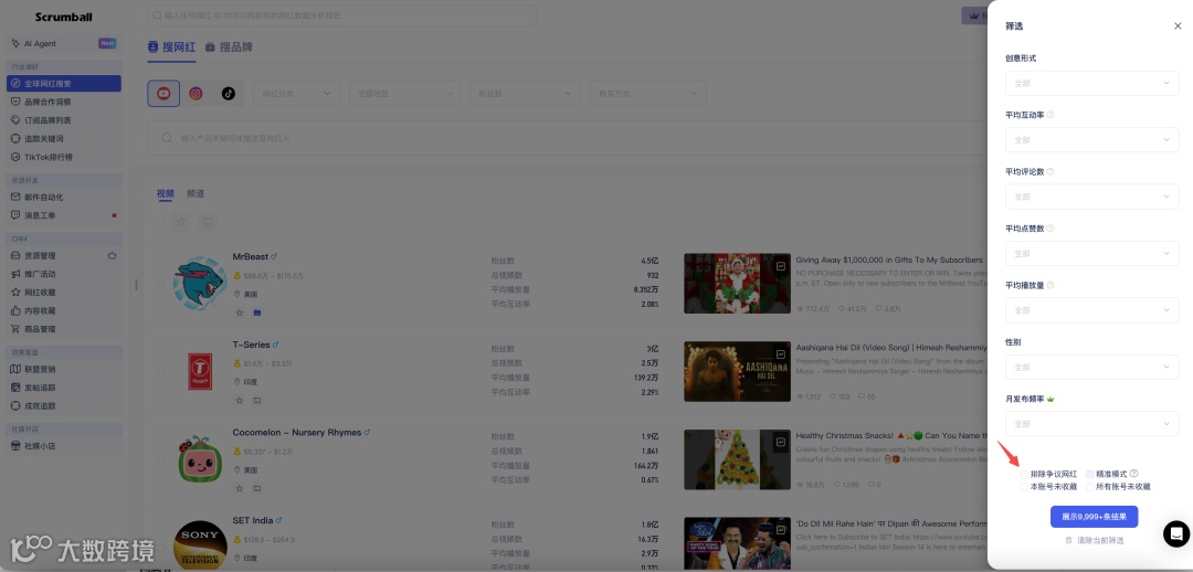 Scrumball全球网红搜索现已支持“一键排除争议网红”功能。在筛选过程中,系统将自动过滤已被标记的争议账号,有效规避网红逃单、数据造假、交付延期等常见风险。