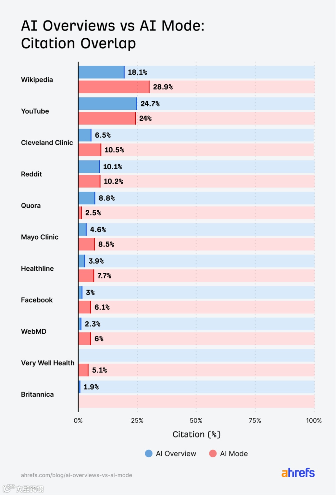 Ahrefs基于73万条数据对比发现,谷歌AI Overview与AI Mode在引用来源上存在显著差异: