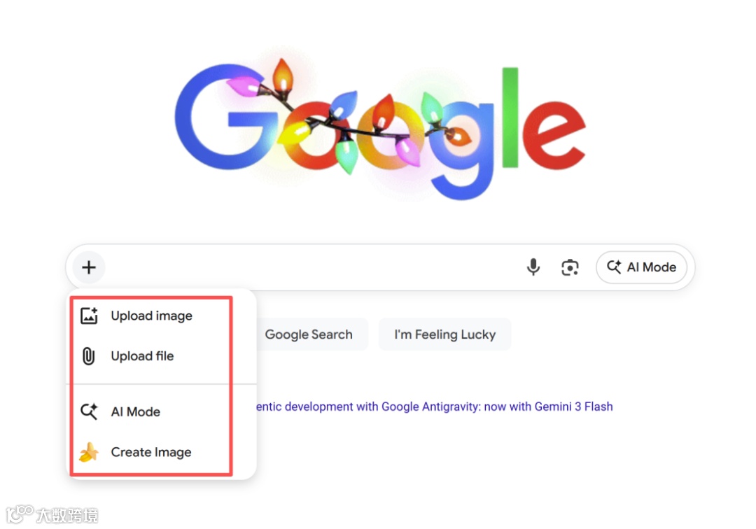 谷歌搜索框左侧新增“+”按钮,支持用户直接上传图片或PDF文档,自动进入AI Mode进行内容分析。