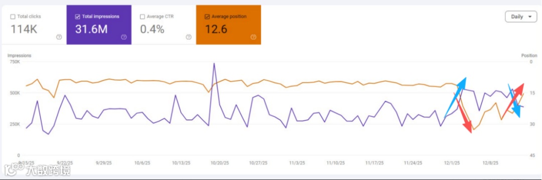 但从12月5日起,部分网站出现反向异常:GSC展示量骤增、平均排名快速提升(即数值变小),趋势与此前相反。