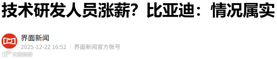 12月22日,据多家媒体报道,比亚迪技术研发人员涨薪的消息得到官方证实。本次涨薪主要覆盖岗位晋升员工、前两年入职的校招生以及长期未跳槽的绩效优良者,体现了公司精准激励的策略。