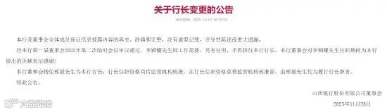 山西银行官网近期公告,山西银行董事会聘任邢毅先生为该行行长,行长任职资格尚待监管机构核准,在行长任职资格获得监管机构核准前,由邢毅先生代为履行行长职责。