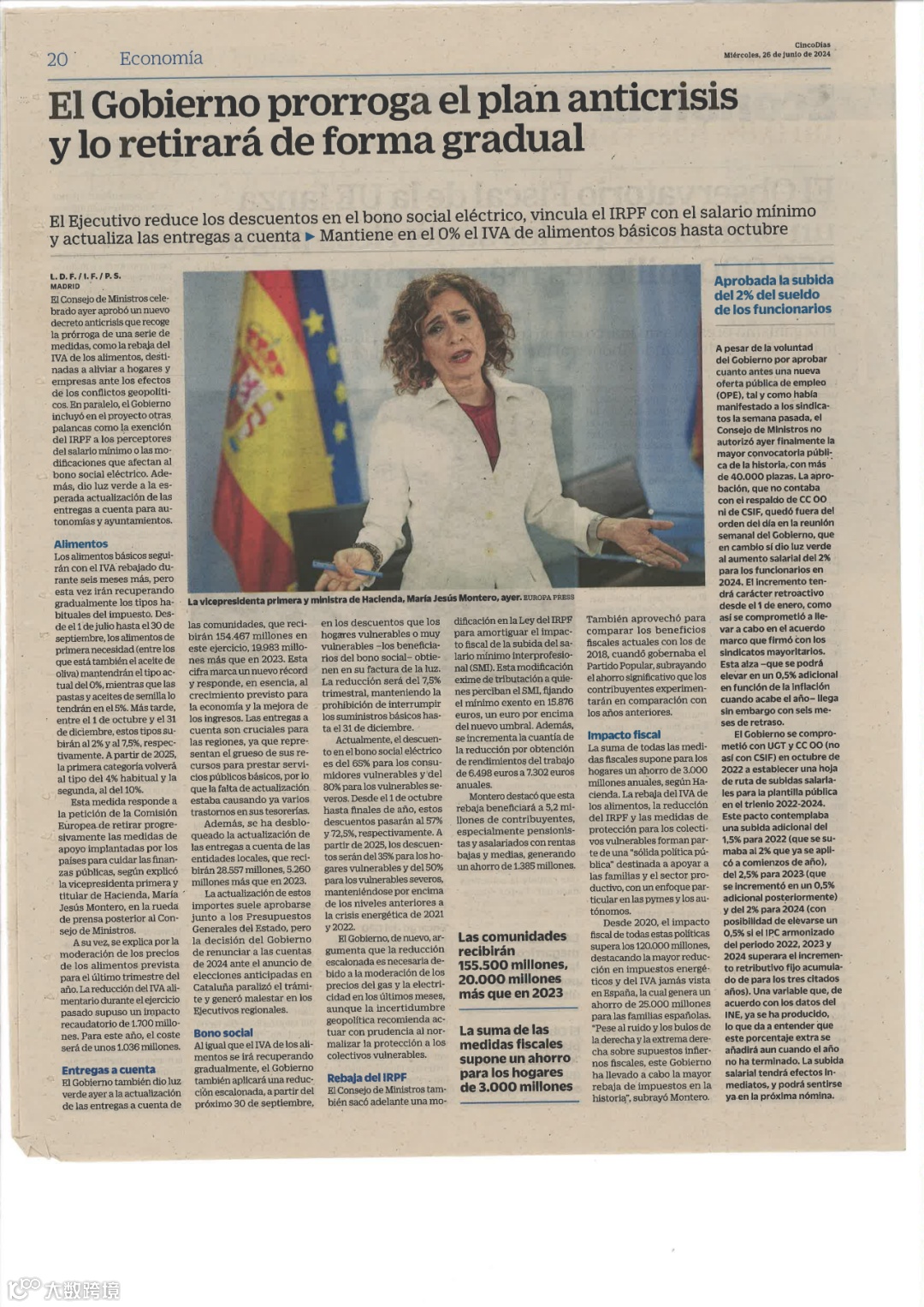 为维持西班牙300万名公务人员之实质购买能力,政府将参照通膨相关数据调增公务员薪资2%,并追溯自本年1月1日起生效。