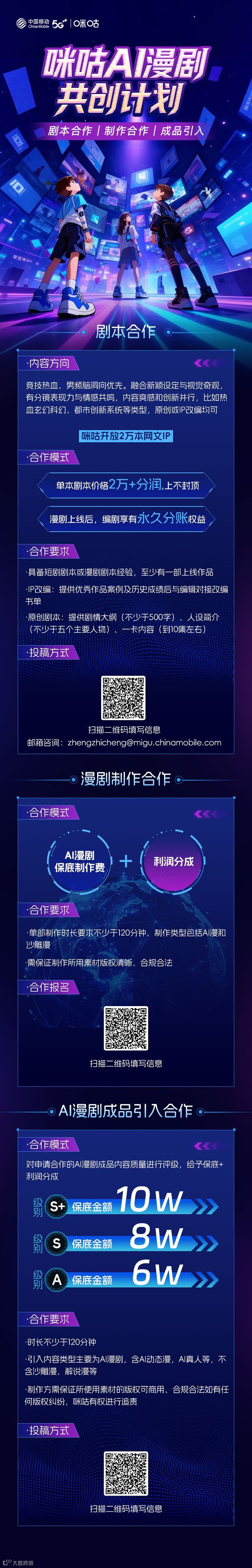 新赛事方面,咪咕举办了第十届“咪咕杯”创作大赛,致力于扶持一切创新的好故事。单项奖金达50万元,累计奖金可超200万元。短剧、AI剧改编上线即可获得额外奖金激励,并联动优酷、芒果、新丽、马厩等平台与近20家影视公司评委团,为好故事铺就影视化通途。