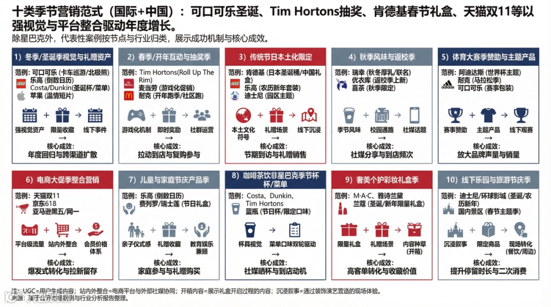 冬季营销聚焦氛围营造与礼赠仪式。可口可乐凭借圣诞卡车巡游与北极熊形象,成功将品牌植入为冬季视觉信号;乐高、费列罗、雅诗兰黛则通过倒数日历与限量礼盒,将消费转化为情感仪式,推动高客单价转化与收藏热。