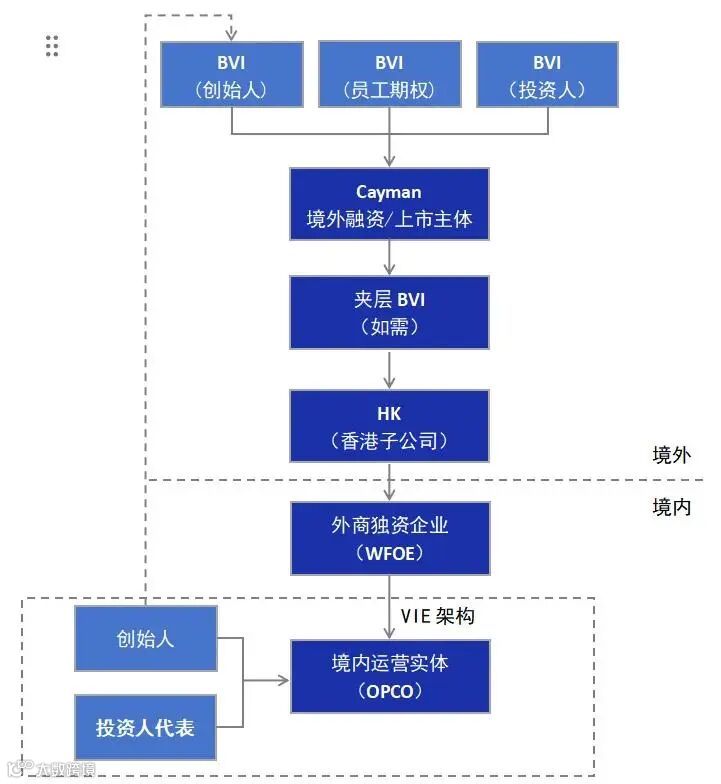 典型架构:境内创始人/股东 → BVI公司(持股主体)→ 开曼公司(上市主体)→ 香港公司(中间控股公司)→ 外商独资企业(WFOE) → 境内运营公司。