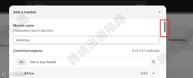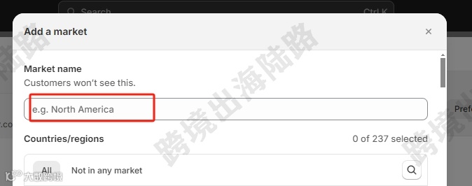 6.输入目标国家进行市场命名,比如我们设置美国是主要市场,那这里输入America。顾客是看不到这个市场名称的,所以您用中文或英文都可以