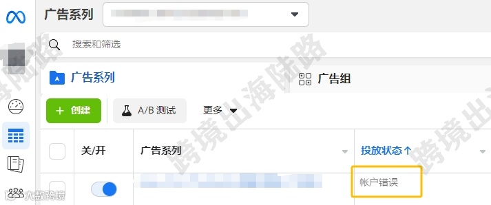 如果我们在Facebook广告账户投放过程中,投放状态出现账户错误(如下图),那一般就是Facebook广告账户没有广告费余额了,可以通过以下步骤进行检查。