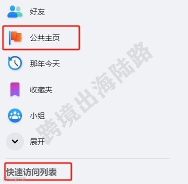 1.打开并登录您的Facebook个人号,访问登录链接:https://www.facebook.com/。登录之后,在页面左侧可找到公共主页,如果没有,点击展开。