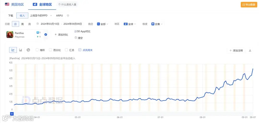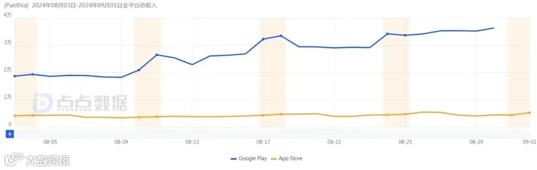 而近日美国 Google Play 手游畅销榜上出现的一款名为「Panthia-Magical Merge Game(简称为Panthia)」的 Merge 3 合成游戏,在 2022 年 4 月正式上线,2024 年 8 月中旬开始起量爬榜,截至 9 月 2 日游戏位居美国Google Play手游畅销榜第 144 位。游戏最近 30 天流水达到 96 万美元,日流水已经突破 4 万美元。目前游戏超过 85% 的流水都来自 Google Play,iOS 端尚未起量。