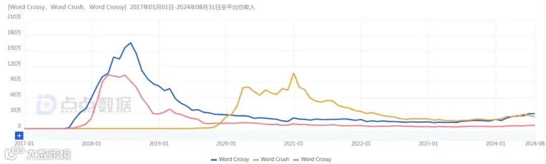 贝塔科技最早以云图微动(FOTOABLE)的名义靠摄影 App 跑出成绩,从 2017 年开始转型手游。首先入场的赛道是单词游戏,旗下产品「Word Crossy」在 2017 年 8 月上线,在 2018 年最高曾突破 300 万美元(约合 2134 万人民币),逼近该品类头部产品「Word With Friends」。不过高流水并未持续太久,从 2018 年下半年开始就大幅下滑,被表现坚挺的「Word With Friends」拉开差距。