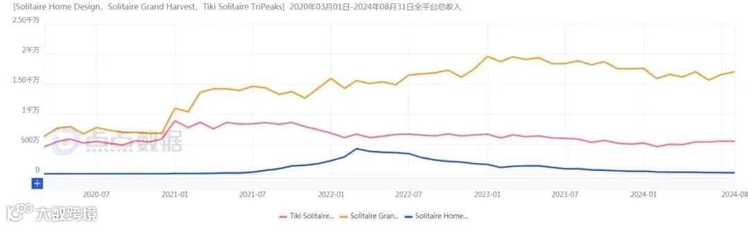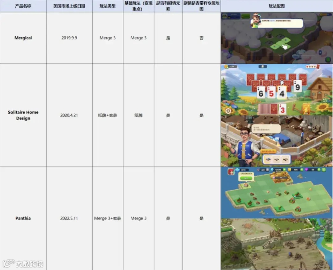 在单词游戏试水之后,贝塔科技开始进入流水天花板更高的休闲赛道,在“纸牌+家装”和合成上跑出成绩。不过这两条赛道的头部产品和「Word Crossy」一样没能做到长红。