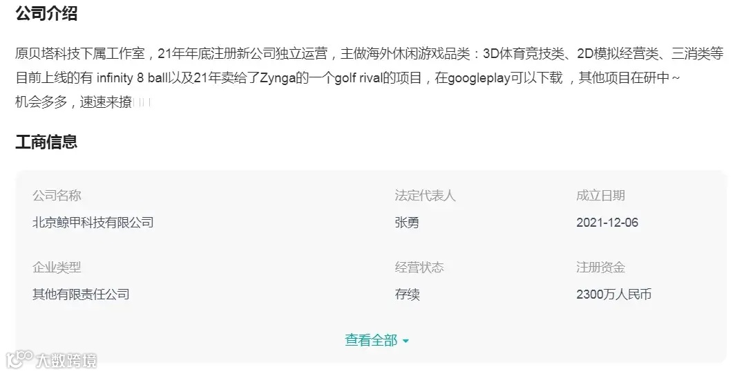 data.ai 数据显示,「Panthia」的发行账号为“Playorcas”,通过比对上线游戏可以得知背后厂商为北京鲸甲科技。鲸甲科技的 Boss 直聘资料显示该公司此前是贝塔科技旗下子公司,2021 年开始独立运营。