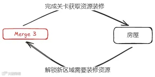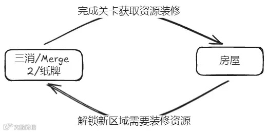而这种经典的设计套路,除了三消和 Merge 2 之外,纸牌游戏也早有应用。贝塔网络的「Solitaire Home Design」就是典型,只不过将提供装修资源的玩法变成了纸牌。“Merge 2/三消/纸牌—+家装”的核心循环可以总结为下图。