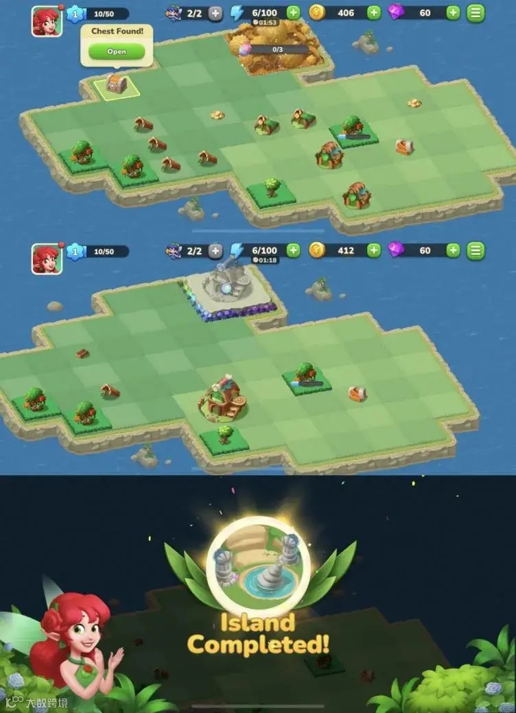 此外,虽然「Panthia」里 Merge 3 被截成多个小地图;但每个小地图里也都保留了一定深度。玩家依然需要通过合成来在小地图里解锁不同区域,直到合成出指定建筑物,并移动到指定位置。
