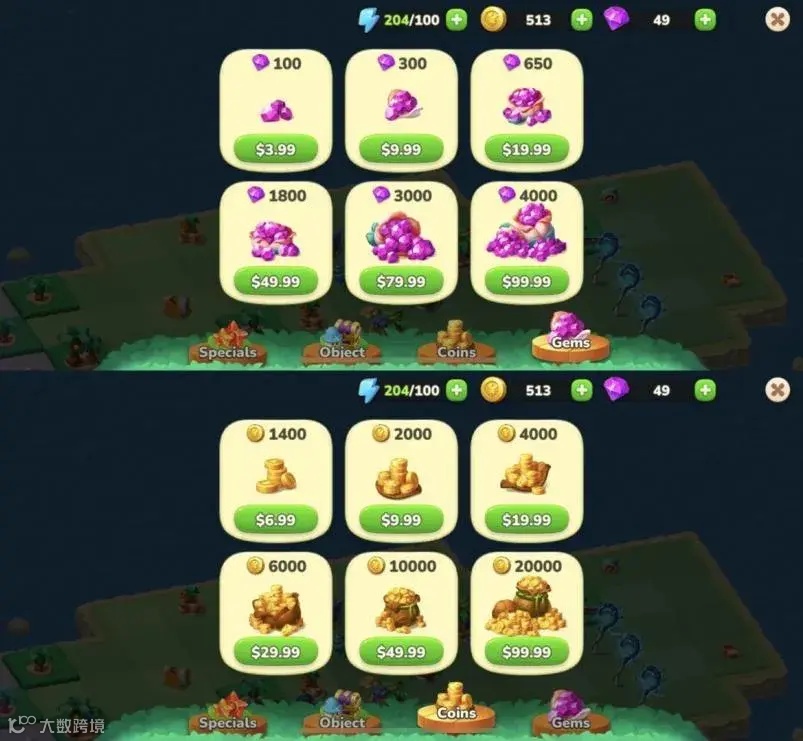 不过我们整体体验下来,虽然在形式上更像 Merge 2,但「Panthia」的节奏还是偏慢,更接近传统 Merge 3。游戏有两类可以直接内购的资源——红宝石和硬币,红宝石对应合成里面主要卡的变现点体力,硬币可以直接购买一些合成所需的关键物品。笔者玩到第三个 Merge 3 关卡的时候就发现体力有些不够用,需要消耗红宝石恢复,而红宝石的消耗量还会随着回复体力次数大幅增加,因此很快就需要内购,要么就需要等上一段时间。