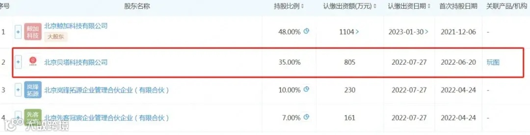 来自企查查的资料则显示,虽然目前已经独立,但贝塔科技依然持有鲸甲科技 35% 的股份,2 家公司也在同一个大楼里办公。