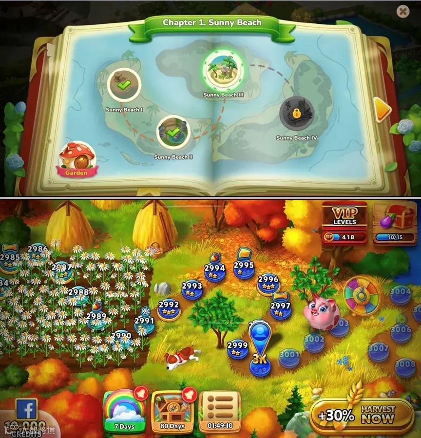 首先,「Panthia」把 Merge 3 里的小号合成地图也做成了不同风格景色的小场景,再通过“魔法王国历险”主题故事书的形式呈现给玩家,在装修房屋的主线之外单独形成一条“副线”。不仅把Merge 3和装修玩法用同样的奇幻主题串在了一起,让两种玩法之间的衔接更丝滑;还通过更丰富的美术变化来留住玩家,这种呈现形式在纸牌游戏里也有应用。