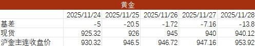 本周周内金价持续上升,沪金主连收盘价953.92元/克,上海有色网现货价格940.12元/克,基差-13.8元/克。