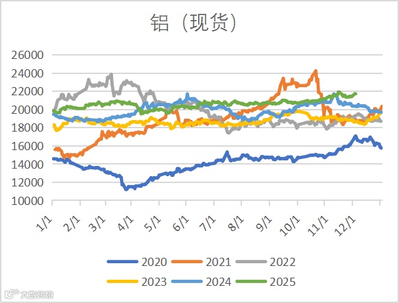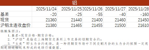本周周内铝价震荡上行,截至11月28日沪铝主连收盘价21610元/吨,上海有色网现货价格21450元/吨,基差-160元/吨。