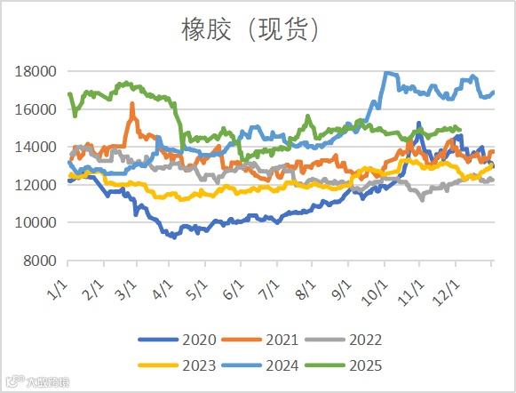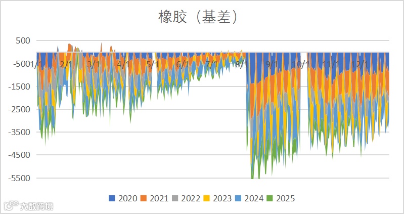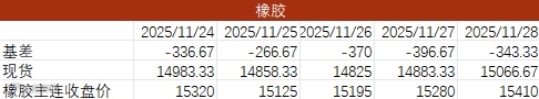本周周内橡胶主连收盘价震荡上行,橡胶主连收盘价15410元/吨,上海有色网现货价格15066.67元/吨,基差-343.33元/吨。