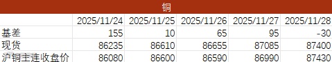 本周周内铜价持续上升,沪铜主连收盘价87430元/吨,上海有色网现货价格87400元/吨,基差-30元/吨。