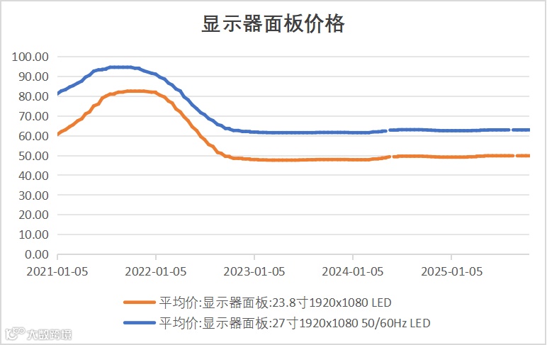 2025年11月20日显示器面板价格与前两周价格持平,27寸63.00美元/片,23.8寸49.9美元/片。