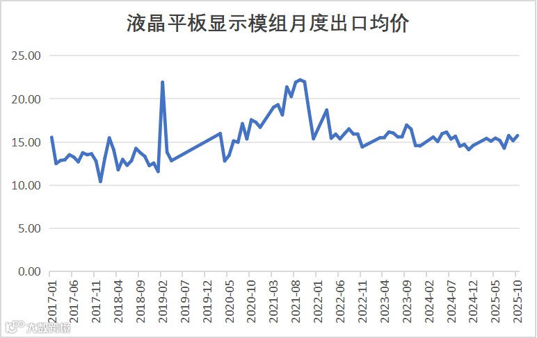 2025年10月液晶平板显示模组月度出口均价为15.74万美元/万个,较2025年9月环比上升0.04%。