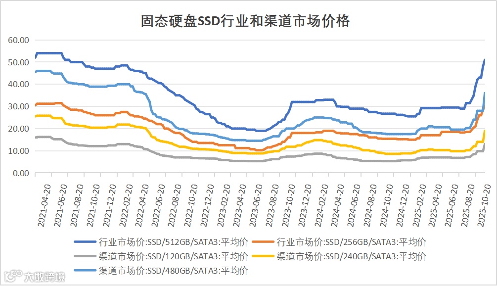 2025年11月24日固态硬盘SSD行业和渠道市场价格较两个月前有所波动:行业市场价:SSD/512GB/SATA 3的均价为51美元,较两个月前上升75.86%;行业市场价:SSD/256GB/SATA 3的均价为30美元,较两个月上升64.84%;渠道市场价:SSD/120GB/SATA 3的均价为13美元,较两个月前上升91.18%;渠道市场价:SSD/240GB/SATA 3的均价为19美元,较两个月前上升93.88%;渠道市场价:SSD/480GB/SATA 3的均价为36美元,较两个月前上升84.62%。