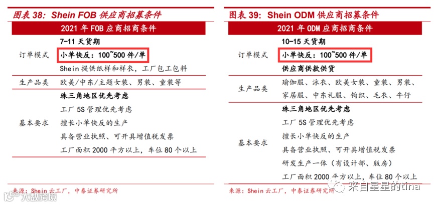SHEIN要求其供应商可以接最低100件的订单(VS. Zara是500件),但是SHEIN会主动给工厂“小单快返”的补贴资金,并承担成本高昂的样衣打板工作。