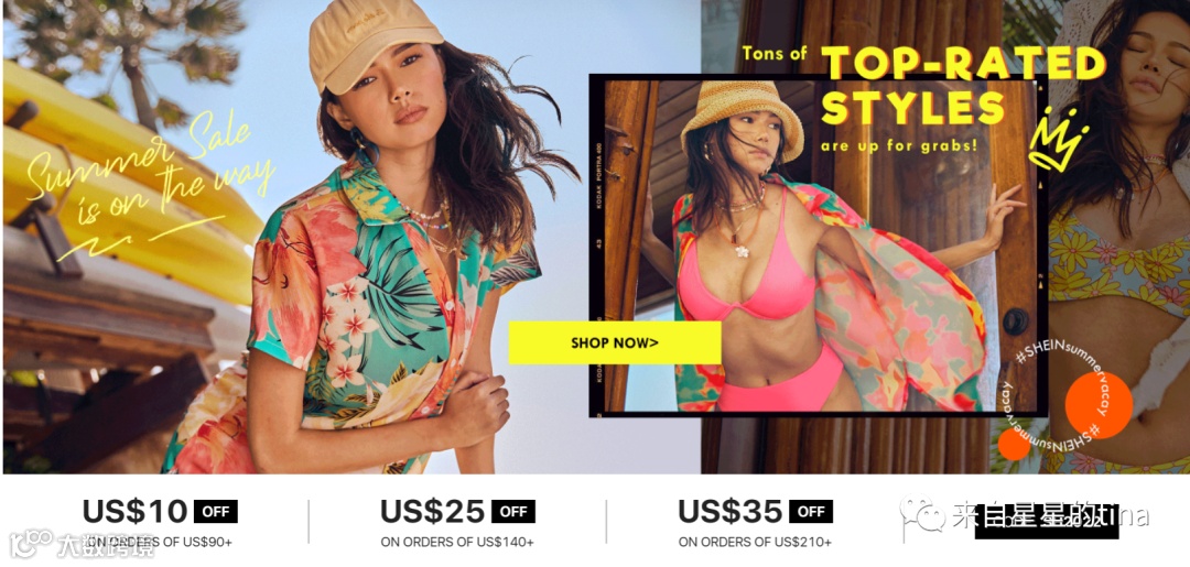 风靡欧美,打开SHEIN的官网,满屏的各种风格女装和打折。第一个跳入我脑海的词是”colorful”, 正符合欧美人的审美;第二个词是“wow, 真便宜”,全世界的人都喜欢便宜的东西。