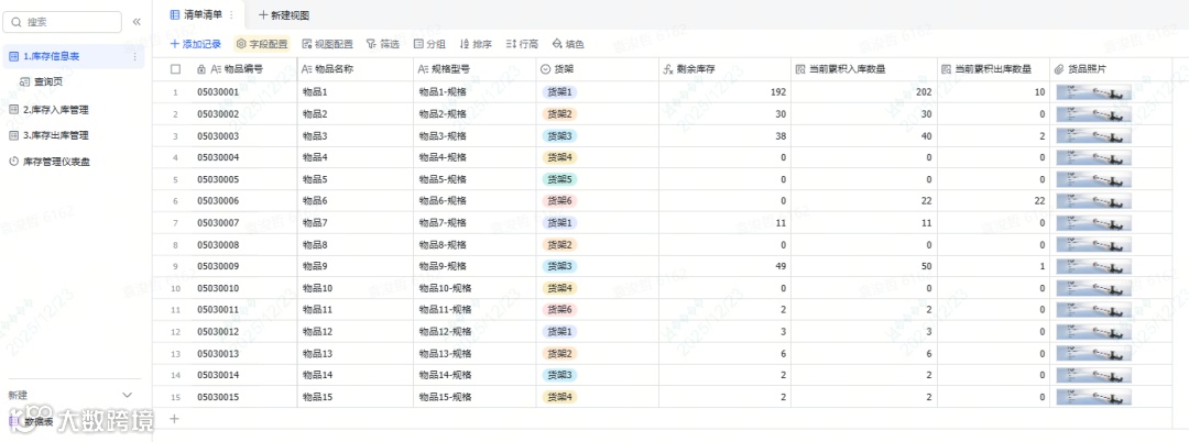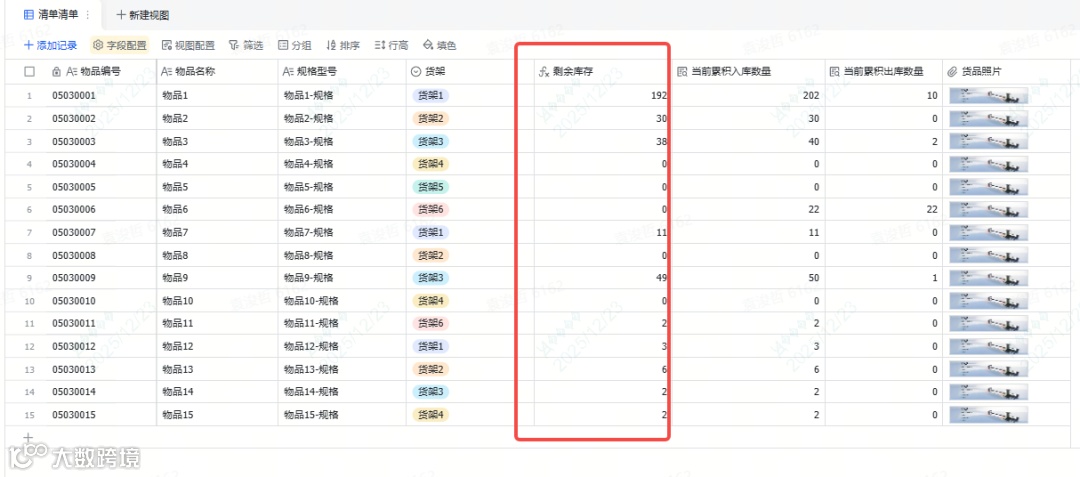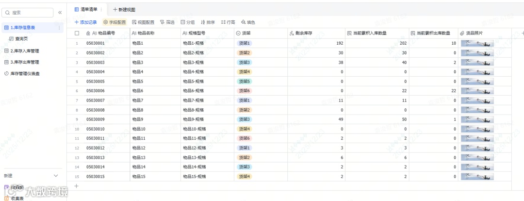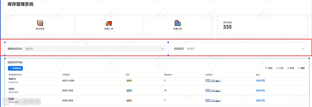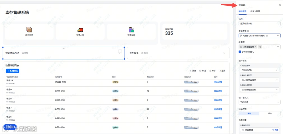 - 切片器组件:实现搜索与筛选功能,如按物品名称查找库存