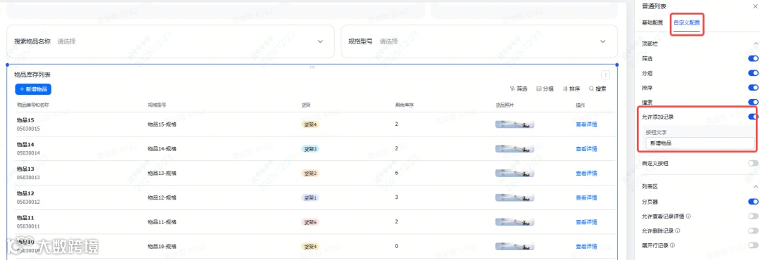 - 按钮组件:用于设置快捷入口,如“新增物品”、“查看详情”