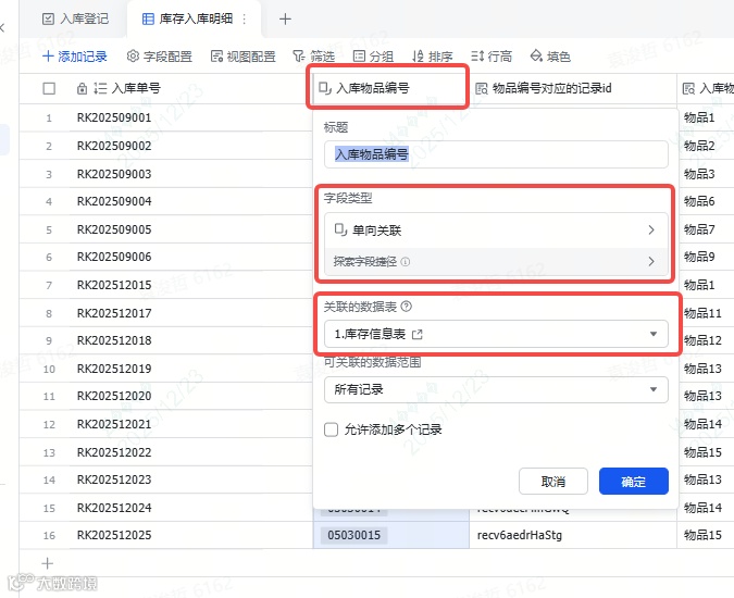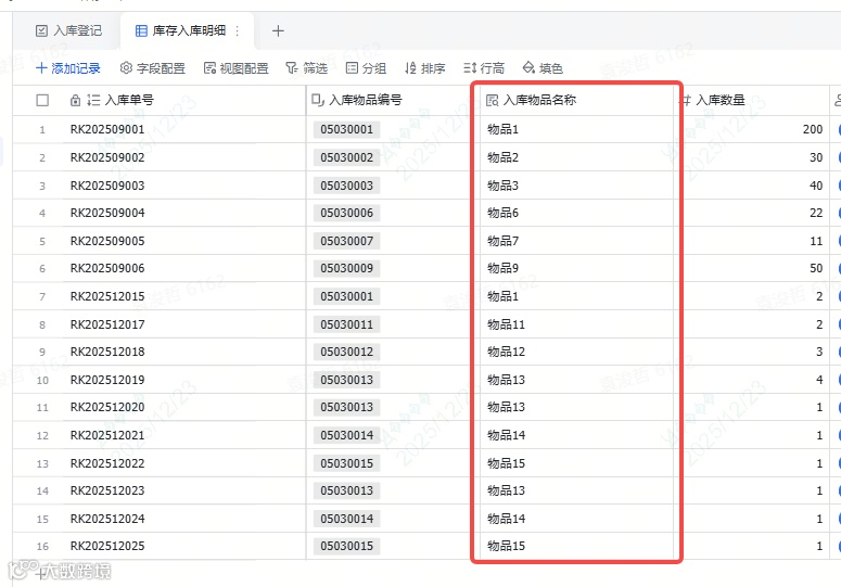 入库单号、关联物品编号、物品名称、入库数量、入库人、入库日期 |