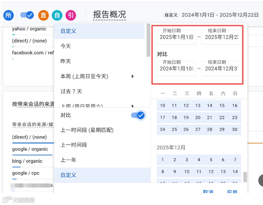 - 操作:进入GA4报告概览 → 设置对比周期(如2023 vs 2024)→ 导出全年流量数据。