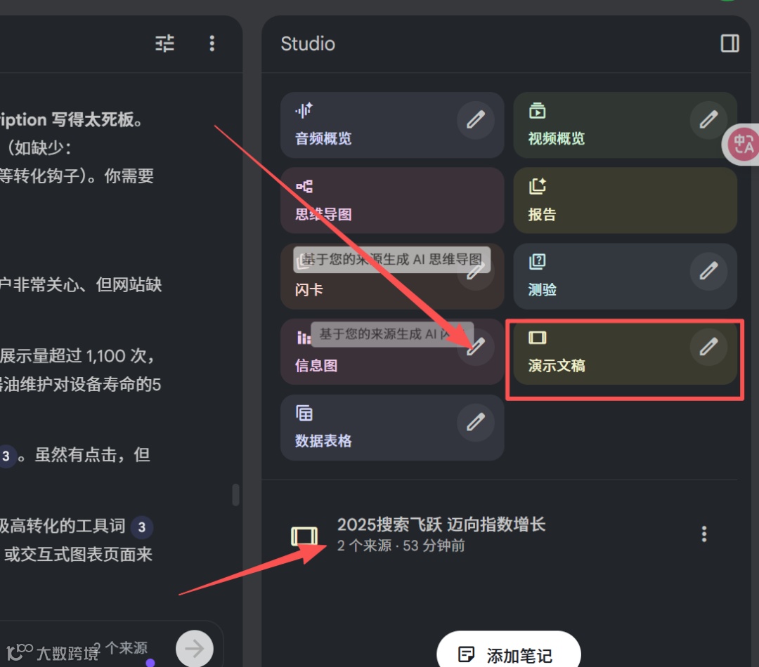 - 利用其最新功能,在右侧建议栏点击“演示文稿”,即可自动生成结构化PPT内容,包含标题、数据洞察与战略建议,甚至附带演讲备注。